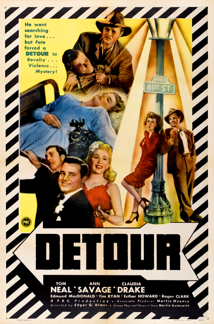 This was one of the more difficult entries to situate in the countdown; I’m still not confident about where it ended up. Just to be perfectly clear, I feel as if I might have placed Side Street too high, rather than too low. The illustration of Granger and O’Donnell is very reserved compared to that seen on many of the other entries — which is something I appreciate. There’s a quiet elegance happening that I wanted to reward, along with the use of the sign motif that we’ll see again on the poster for Detour — very iconic for film noir. Once again I’m pleased with a strong diagonal composition, divided in half by the sign pole. However, I find the photographic imagery at the poster’s left edge to be disappointing. It’s awkwardly presented, with halftones that are somehow lighter than the surrounding blue-purple background. Such gray shadows aren’t very seductive, and instead give the poster a cheap, unfinished look that almost wrecks it. I think we’d have a better design if those images could be removed, and the “fate dropped…” tag shifted into that area.
