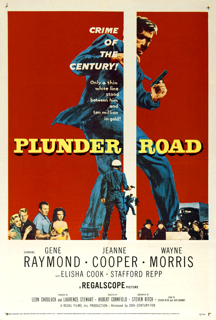 The poster for Plunder Road is one of my favorites in the countdown, and goes a long way to proving what a skilled designer can do with very little raw material. A few words about the film first, which most of you probably haven’t seen yet: In case you haven’t had the pleasure, it’s one of the many noirs now streaming at Netflix — here’s a link to the film. (Beware though, Steve-O from Noir of the Week reports that this isn’t the greatest copy in the world.) Nevertheless, this is a film that all crime enthusiasts fall in love with from the get-go. I’m never come across a noir buff that doesn’t like it. It’s a first rate heist picture, with an incredibly fatalistic ending. The poster is just as good — sporting as powerful a use of negative space as we are likely to see, both in terms of the large red rectangle and the white strip that violates it. Does the stripe represent the road, or merely the white line diving the lanes? Is it some barrier through which the hoodlums in the film must somehow crash through? Or is it merely a graphic device used to push the poster closer to the avant garde? As far as I’m concerned it is all of those things! Furthermore, I love how this poster plays with scale, depth, and perspective though the juxtaposition of the figures, even if they are just swiped from publicity stills.