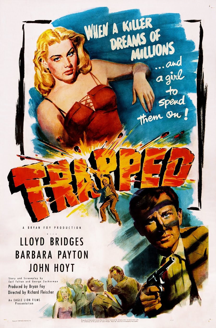 Could there be any doubt that this magnificent poster is the featured entry this week? Not in my mind — I’m resisting every urge I have to move it up in the countdown. Another Poverty Row gem, the poster for Trapped scores with both genders, perfectly representing the film noir male and female. Let’s start at the top, with tragic beauty Barbara Payton. We won’t get into Payton’s story here (though I do in the essay for Murder is My Beat), but for those of you unfamiliar with her, I can tell you that the artist has captured her screen persona perfectly. Her sexy but trashy, slightly frayed, come-hither look, cast directly at the viewer is just extraordinary, and it’s matched by John Hoyt underneath. I’m surprised at the choice of Hoyt for the poster, considering that Lloyd Bridges is the film’s star, but it isn’t the identity of the man that’s important, it’s the use of light and shadow. When we think of film noir, one of the more ubiquitous visual signifiers are the shadows cast by the slats of window blinds, yet the poster for Trapped is one of the only film advertisements that utilizes them — and it does so to spectacular effect. The tagline is delicious, the title typography is first-rate, and the small illustrations at the bottom of the composition are truly something else! With posters this good, there must be some real gems in the queue!