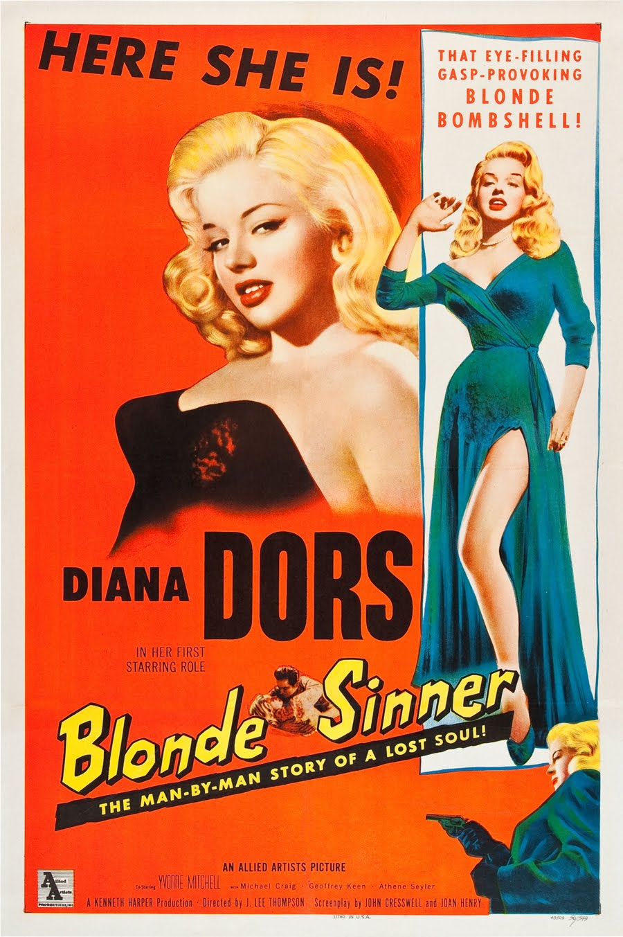 On the merits of its title alone, this film gets a free pass to the top thirty! If you take a quick look back at Blonde Alibi (#61) you’ll see that the poster for the similarly titled Blonde Sinner is trashier, sexier, and even manages to include some gunplay — thus the higher spot. You’ve just gotta love a poster with four separate shots of the same girl. No one is going to argue that the design here is stellar, but the imagery is vivid and integrated into the composition with a surprising amount of care, especially considering this is a Poverty Row movie. What am I talking about? Notice how much better the photos of Diana are clipped from the respective backgrounds than is the image of Evelyn Keyes on The Prowler. Notice also how the designer applied a painted shadow to help her fit into the red background with a little more ease; not to mention the careful transition from her torso to the title typography — carefully executed with an airbrush instead of a scissors. There’s a lot going on here, and I’d love to see the title a little larger — maybe at the expense of one of the images, but this is still a really fun poster.